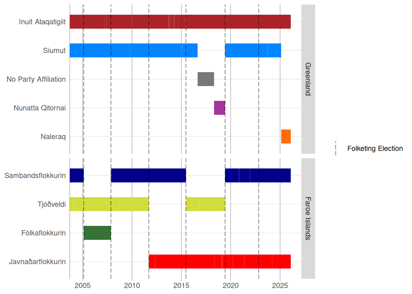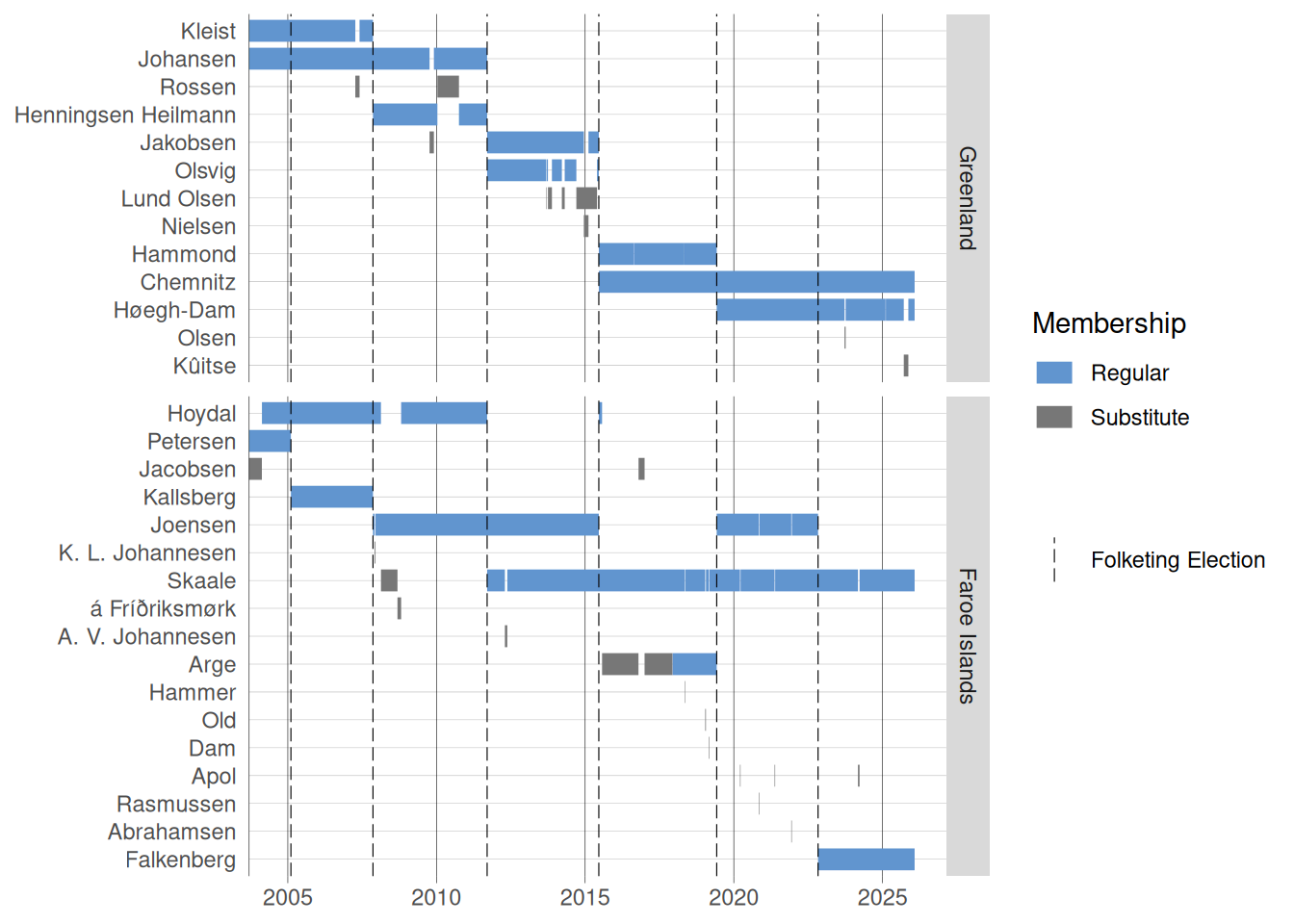 Earlier terms served by Edmund Joensen and Lisbeth Petersen are cut off from the timeline since there are no voting records available online earlier than October 07, 2004. For MPs representing Greenland resp. the Faroe Islands in election periods earlier than October 2004, see the full timeline – going back to 1953 – provided by Harder (2022b).