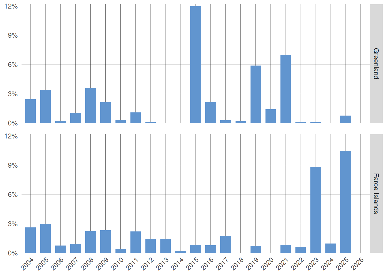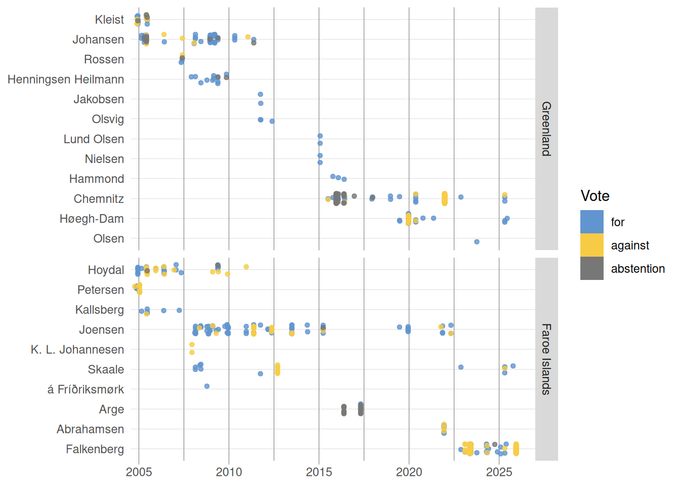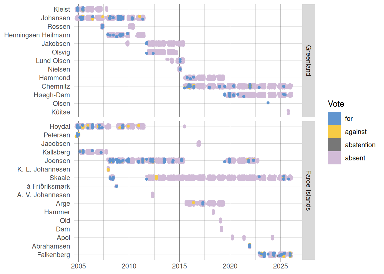 Figure 4 displays the share of records in which a vote is actually cast (for, against, or abstaining) for each year covered by the dataset. A quick glance shows very low proportions overall, with an increasing share of votes cast among MPs from the Faroe Islands in recent years (2023, 2025) and a peak in 2015 for Greenlandic MPs.