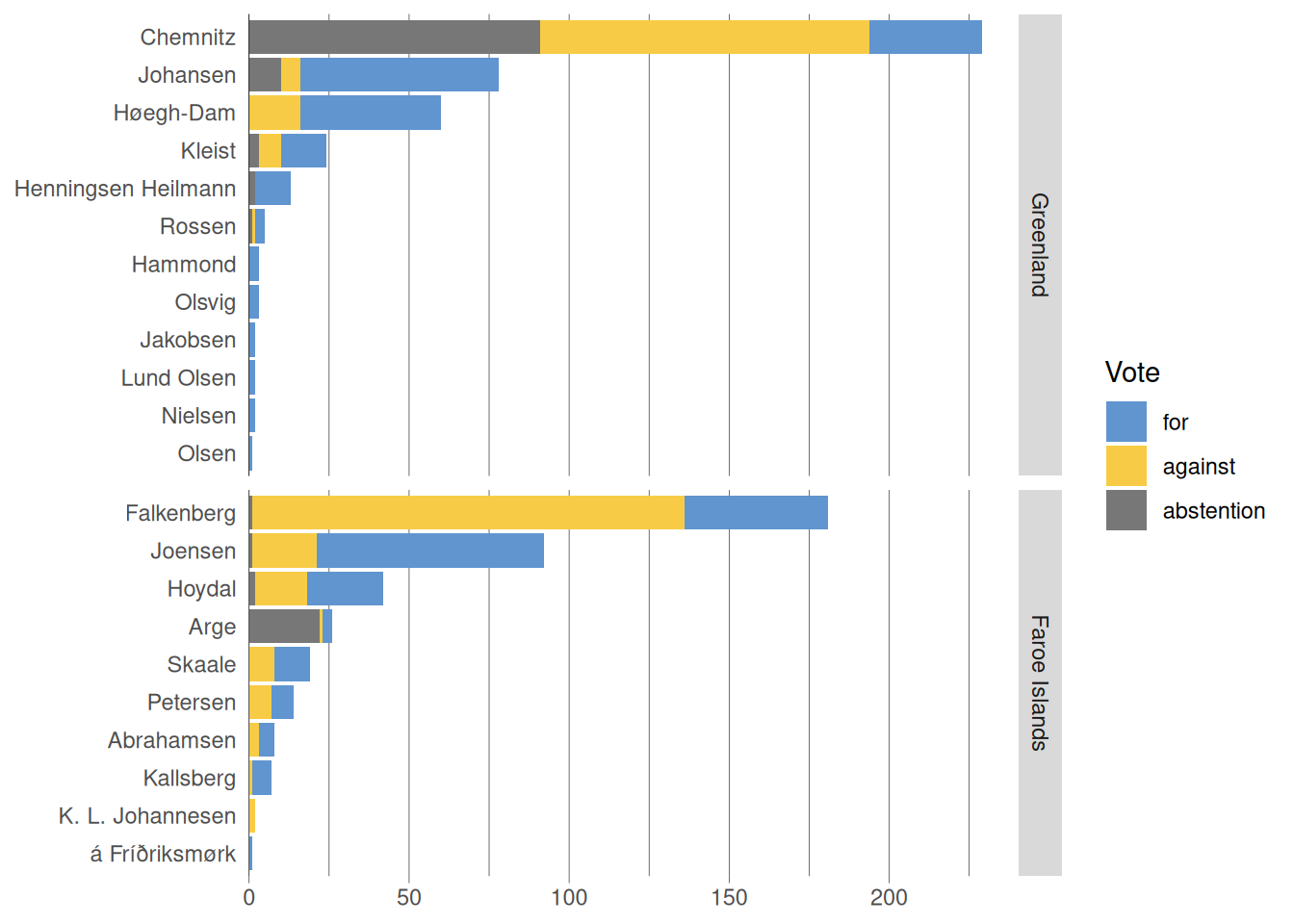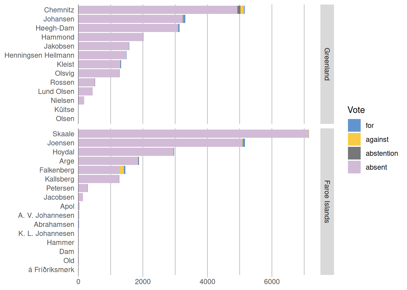 Figure 5 visualizes the distribution of votes cast by each MP that is part of the dataset. MPs are grouped by whether they are representing Greenland or the Faroe Islands. As MPs are absent for most ballots, Figure 6 shows the distribution only with votes that were actually cast.