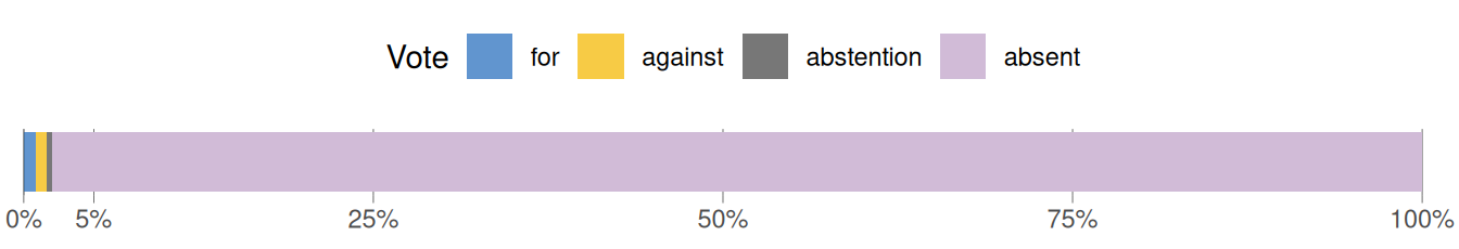On a proposal, members can either vote for, against or neither for or against (abstention). Taking into account all ballots that are recorded in this data set, Greenlandic and Faroese MPs actually cast a vote in just 2.0% of them. For 40085 out of 40899 cases, the MP in question is listed as absent.